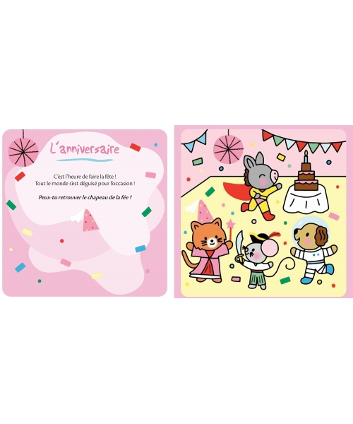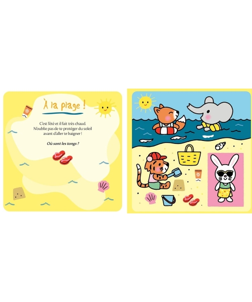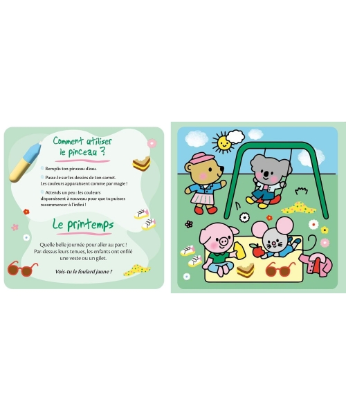 C'est magique ! Il suffit de remplir le pinceau avec de l'eau, puis de le passer sur les 6 décors du carnet pour découvrir toutes sortes d'habits selon les saisons et les occasions : un temps printanier, une sortie à la plage, une fête déguisée, une journée automnale, une bataille de boules de neige et l'heure du coucher !