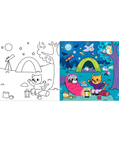 C'est magique ! Il suffit de remplir son pinceau avec de l'eau, puis de le passer sur les 6 décors du carnet pour voir apparaître les magnifiques illustrations sur les activités à faire à la montagne : le ski et la luge, un vol en montgolfière, une balade en forêt, de la pêche autour d'un lac, un pique-nique ou encore de l'accrobranche.