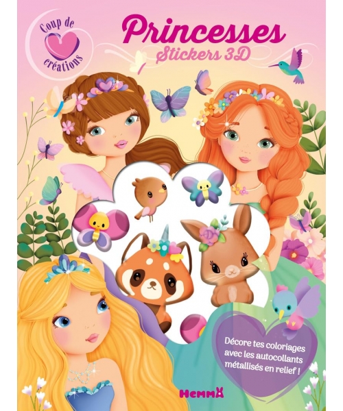 Des stickers d'adorables animaux en 3D et métallisés pour décorer et animer les coloriages de princesses. Un nouveau format dans la collection "Coup de cœur créations" illustrée par Elen Lescoat.