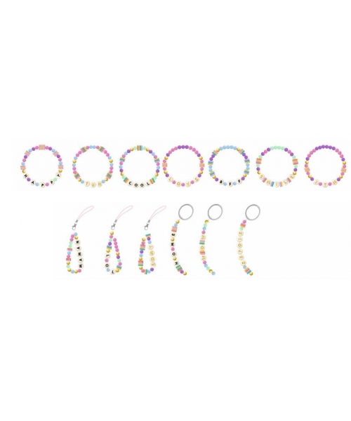 Ta jolie boîte à compartiments contient tout le nécessaire pour créer plus de 10 bracelets d'amitié, des porte-clés et des grigris à personnaliser avec des messages : 150 perles lettres noires ou dorées, du fil élastique, plus de 400 perles colorées rondes et heishi et des perles dorées !