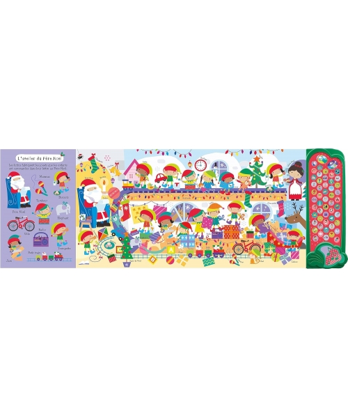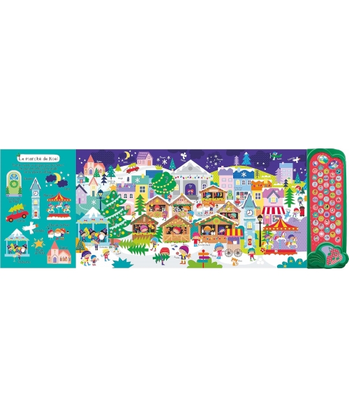 Un livre sonore grand format, avec des pages qui s'ouvrent en panoramique et 50 puces sonores Ce livre sonore grand format va faire découvrir aux jeunes enfants la magie de Noël. Ils vont pouvoir s'amuser à repérer des personnages, des animaux et des objets. 50 sons sont associés aux illustrations. Les pages cartonnées s'ouvrent en format panoramique. Les illustrations à chercher sont de grande taille pour favoriser l'attention. Un livre joyeux et coloré pour exercer la mémoire visuelle et auditive des jeunes enfants.