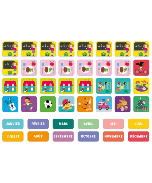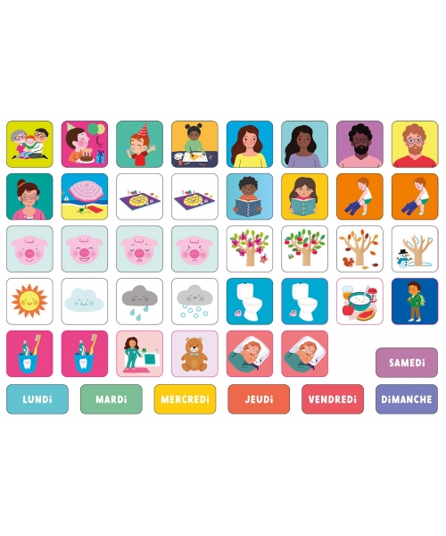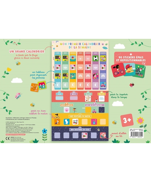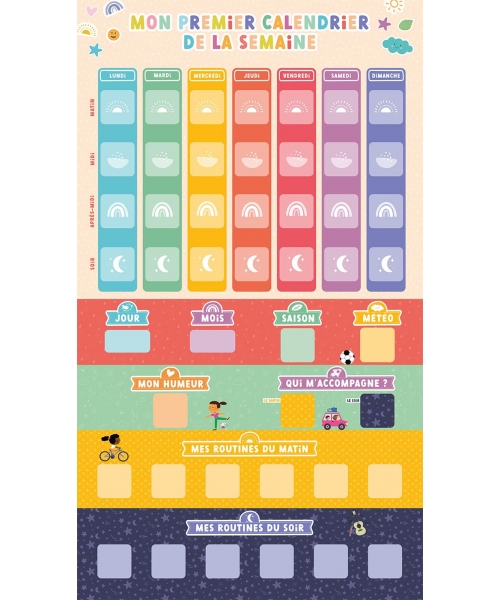 Un grand calendrier à fixer sur le frigo grâce à deux aimants, un tableau pour organiser tes journées, des routines pour ne rien oublier le matin et avant d'aller au lit et plus de 90 stickers épais et repositionnables.