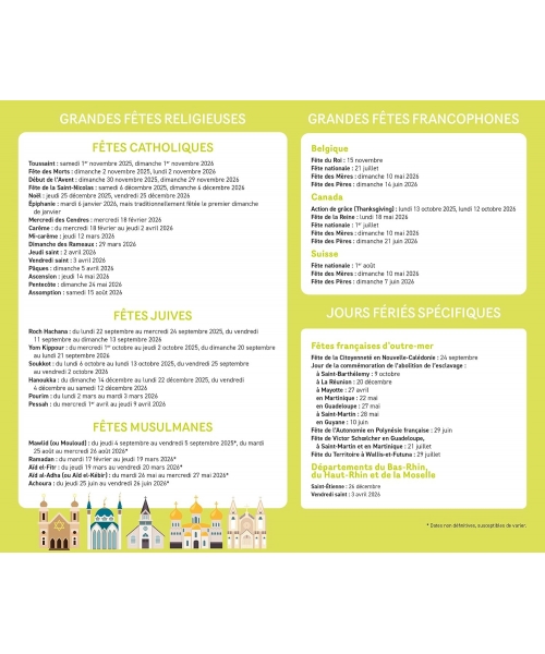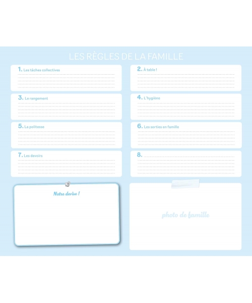 - Des fiches pratiques pour le quotidien (numéros utiles, tableau de mission, to-do list des vacances, règles de la famille, les vacances scolaires par zone, calendrier des grands événements...),