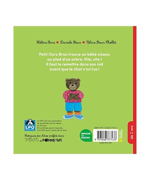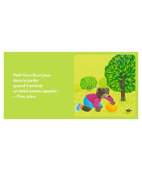 Petit Ours Brun découvre un bébé oiseau tombé au pied d'un arbre. Inquiet, il sait qu'il doit le remettre dans son nid avant que le chat de la forêt n'arrive. Il le prend délicatement dans ses bras et grimpe vite, tout en douceur, pour assurer sa sécurité.