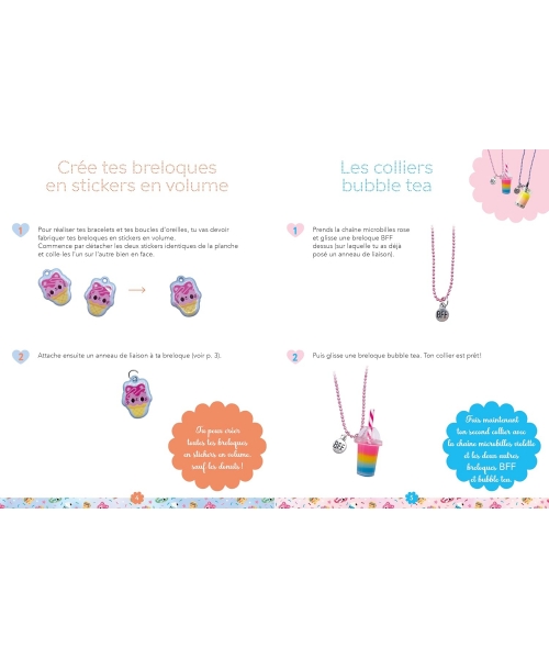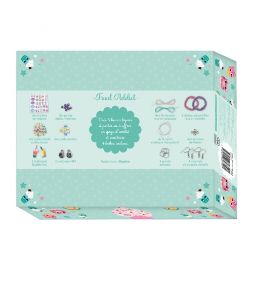 Un coffret contenant tout le matériel nécessaire à la création de 8 bijoux d'amitié, fonctionnant par paire (4 bracelets, 2 colliers et 2 paires de boucles d'oreilles. L'un est à garder, l'autre est à offrir à son âme soeur. Ce coffret contient aussi 4 boîtes en papier, joliment illustrées, à compléter d'un petit mot puis à construire, avant d'y glisser son bijou à offrir. Et un livret de 16 pages avec des pas-à-pas illustrés. 2 colliers avec une breloque bubble tea et une breloque BFF sur une chaîne micro-billes ; des bijoux avec breloques stickers en volume : 2 bracelets en perles Heishi, breloques (pizza, burger, soda, taco, frites, etc.) ; 2 bracelets en fil de jade et donuts ; 2 paires de boucles d'oreilles en perles Heishi et glaces/sunday.