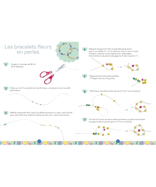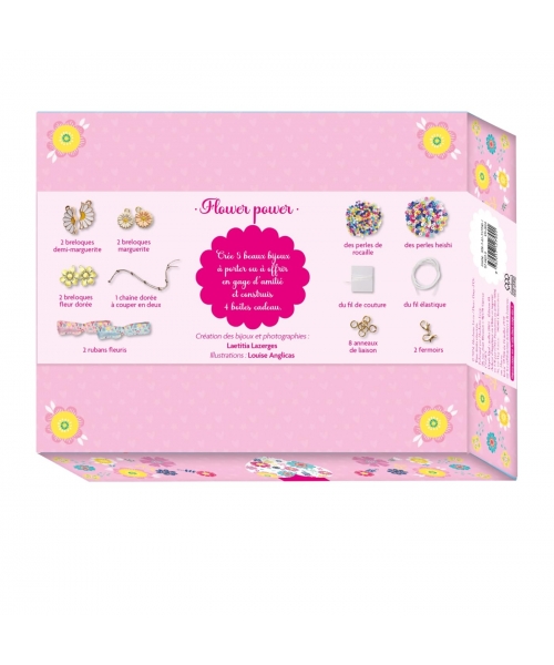 Un coffret contenant tout le matériel nécessaire à la création de 8 bijoux d'amitié, fonctionnant par paire (6 bracelets et 2 colliers), sur le thème flower power, accompagné d'un livret de 16 pages avec des pas-à-pas illustrés. L'un est à garder, l'autre est à offrir à son âme sœur. Ce coffret contient aussi 4 boîtes en papier, joliment illustrées, à compléter d'un petit mot puis à construire, pour y glisser son bijou à offrir. Un beau cadeau, réalisé entièrement par l'enfant et personnalisé.