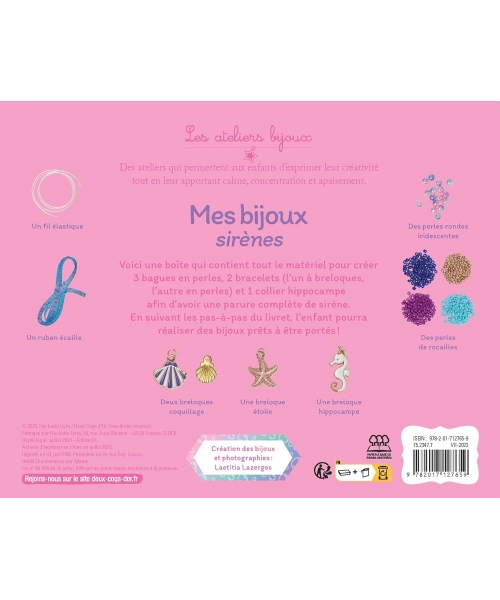 Voici une boîte qui contient tout le matériel pour créer 3 bagues en perles, 2 bracelets (l'un à breloques, l'autre en perles) et 1 collier hippocampe afin d'avoir une parure complète de sirène. En suivant les pas-à-pas du livret, l'enfant pourra réaliser des bijoux prêts à être portés !