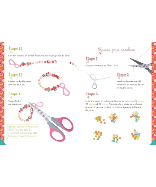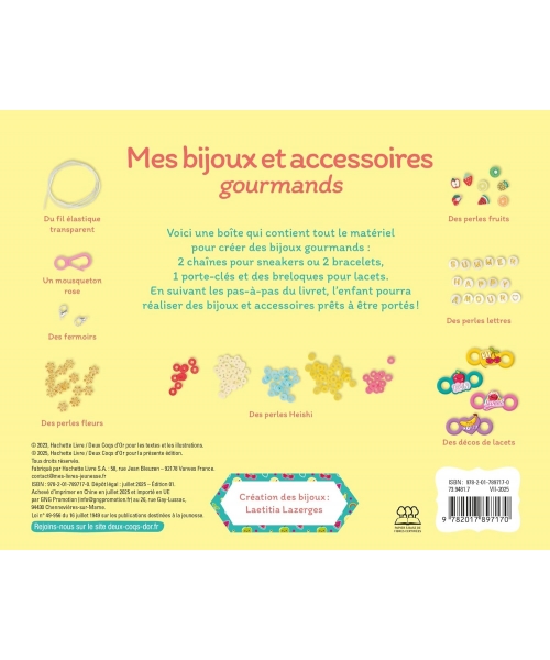 Voici une boîte qui contient tout le matériel pour créer des bijoux gourmands : 2 chaînes pour sneackers ou 2 bracelets, 1 porte-clés et des breloques pour lacets. En suivant les pas-à-pas du livret, l'enfant pourra réaliser des bijoux et accessoires prêts à être portés !