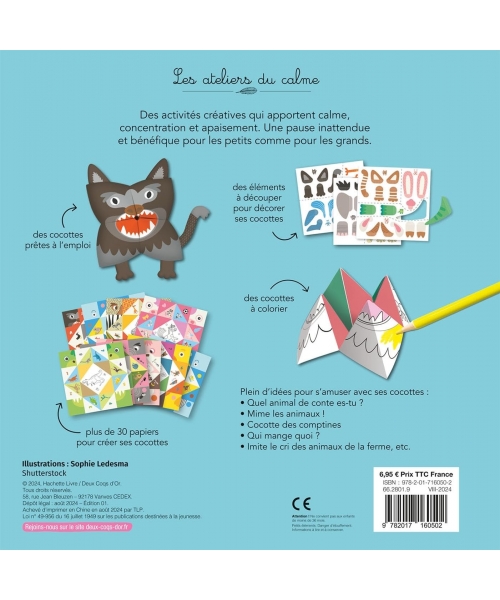 Un cahier proposant, sur le thème des animaux, 30 modèles de cocottes à plier, avec un mode d'emploi très simple et en images. 10 animaux pour créer des cocottes très visuelles parfaitement adaptées aux enfants dès 5 ans, avec de jolis motifs et prêtes à l'emploi, des cocottes à colorier, des cocottes pour simplement jouer avec les têtes des animaux. 4 pages d’éléments à découper permettent d’ajouter des pattes, des oreilles ou encore une queue. De vraies cocottes origami !