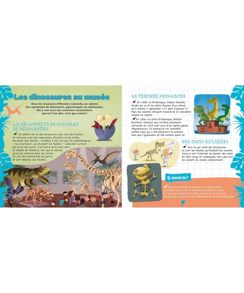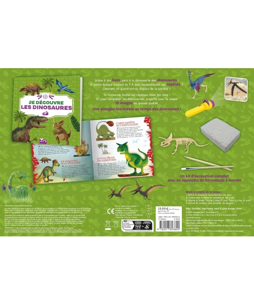 Un coffret avec un livre documentaire de 48 pages pour tout savoir sur les dinosaures, comprenant : 1 lampe (piles fournies) ; 2 rondelles pour projeter 16 images de dinosaures ; 1 kit d'excavation pour découvrir, assembler et monter un tricératops à l'aide d'outils de fouilles archéologiques, un burin en bois et un pinceau et un pas à pas.