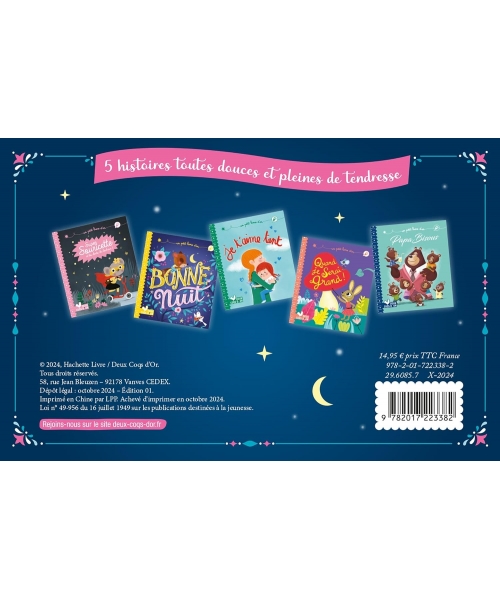 Un coffret qui se présente sous la forme d'une jolie bibliothèque composée de 5 petites histoires douces et tendres, adaptées aux 3-6 ans : Papa Bisous, Bonne nuit, Je t'aime tant, Quand je serai grand, Super souricette et les dents du bonheur.
