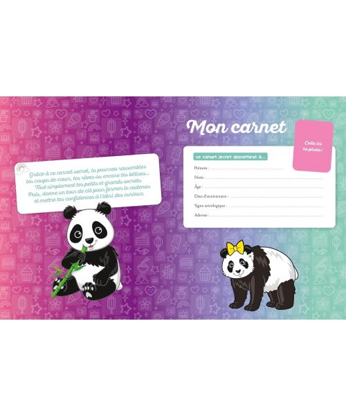 Un carnet de 120 pages, la tête du panda en patch tout doux à caresser en couverture et un cadenas argenté en métal ainsi que 2 clefs. A l'intérieur, des pages éditorialisées : ses rêves, ses meilleurs amis, ses souvenirs..., et 6 scènes de cherche et trouve, mais aussi des pages lignées décorées à remplir.