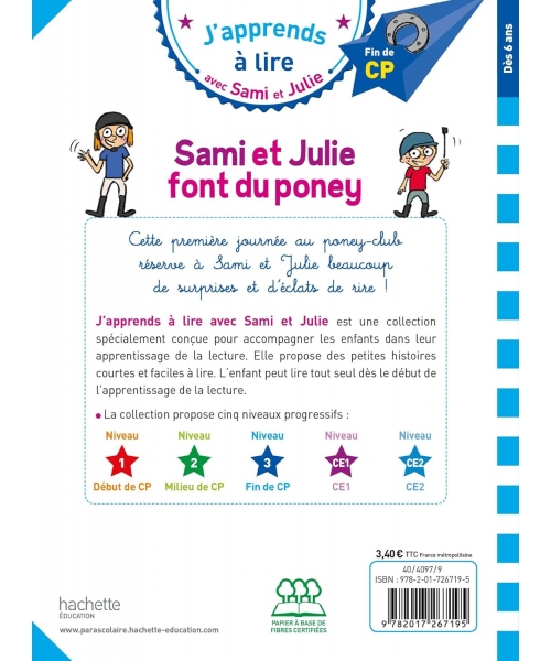 « J’apprends à lire avec Sami et Julie » est une collection de petites histoires spécialement conçue pour les enfants apprenant à lire. Le texte est écrit en gros, les mots sont bien détachés les uns des autres et les lignes bien espacées. Les histoires sont courtes, drôles et très faciles à lire. Écrites avec des mots en adéquation avec leur progression, une quantité de texte à lire réduite et adaptée, pour que l’enfant reste motivé et prenne confiance.