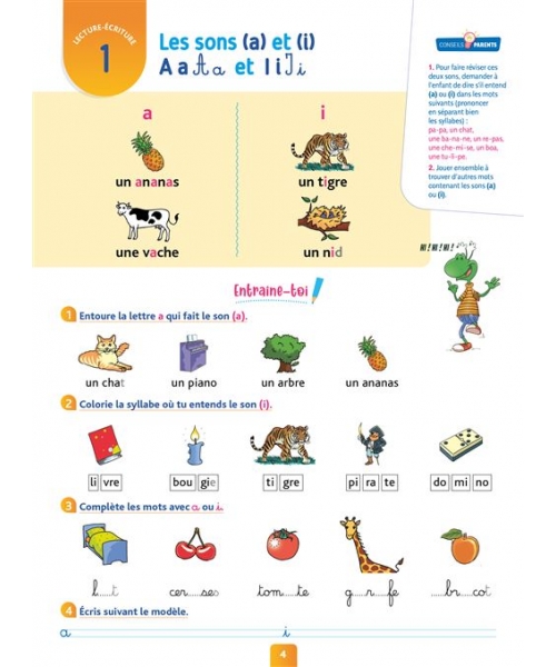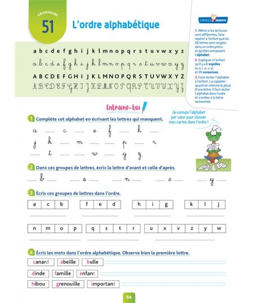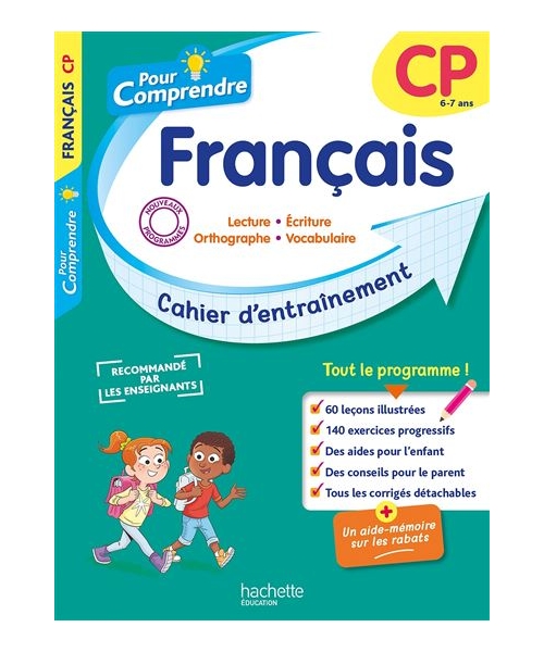 Un cahier d’entraînement pour accompagner votre enfant toute l’année. 60 leçons couvrant tout le programme (lecture, écriture, orthographe, vocabulaire) 140 exercices progressifs pour bien s’entraîner Des aides pour l’enfant et des conseils pour le parent Tous les corrigés détachables au centre du cahier + Un aide-mémoire sur les rabats de la couverture !