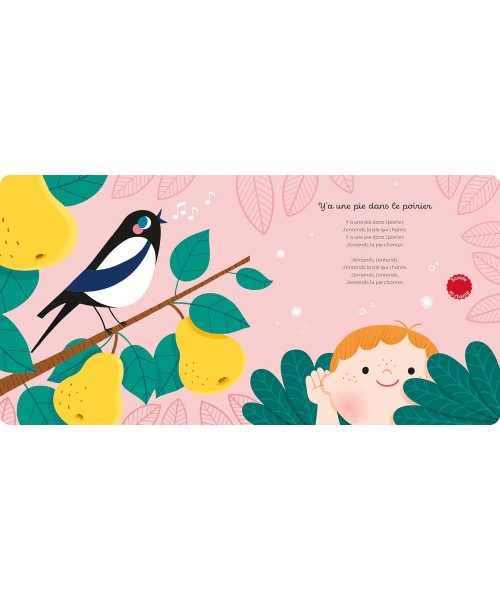 Sur chaque double-page, l’enfant découvre une célèbre comptine, illustrée par une grande image. Chaque texte de chant est accompagné d’une puce-son, signalée par une rondelle rouge « Écoute et chante » très visible, même par les plus petits.
