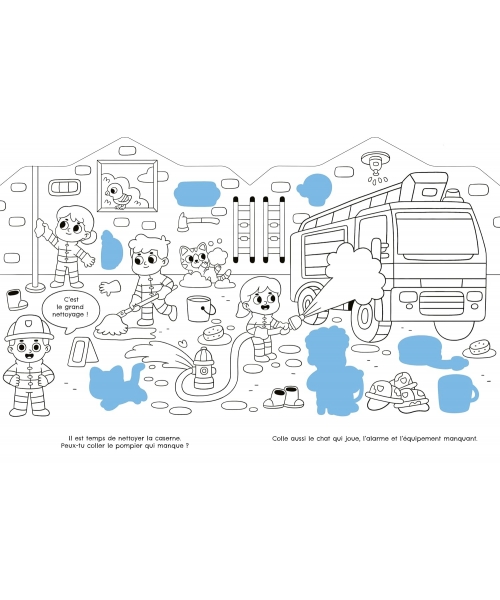 Dans ce livre sur les pompiers, il y a plein de choses à voir : des dessins à colorier, des scènes à compléter et surtout … beaucoup d’autocollants ! En plaçant les autocollants au bon endroit et en coloriant les dessins en noir et blanc, complète les illustrations et donne vie à ce livre !