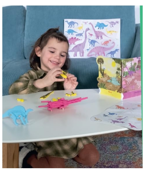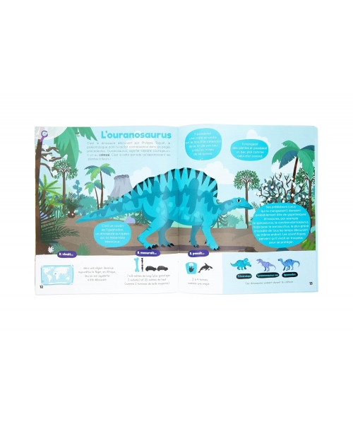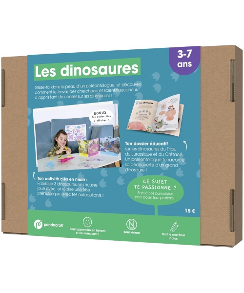 L'enfant se glisse dans la peau d'un paléontologue, et découvre comment le travail des chercheurs et scientifiques nous ont appris tant de choses sur les dinosaures ! Un grand paléontologue l'emmène sur les traces des dinosaures, lui explique son métier et les grandes périodes du Trias, du Jurassique et du Crétacé. L'enfant recrée sa frise préhistorique avec ses autocollants dinosaures et s'amuse à gratter l'encre au dos pour découvrir des fossiles. Il passe à l'action en fabricant 3 figurines de dinosaures en mousse : un dinosaure pour chaque grande époque.