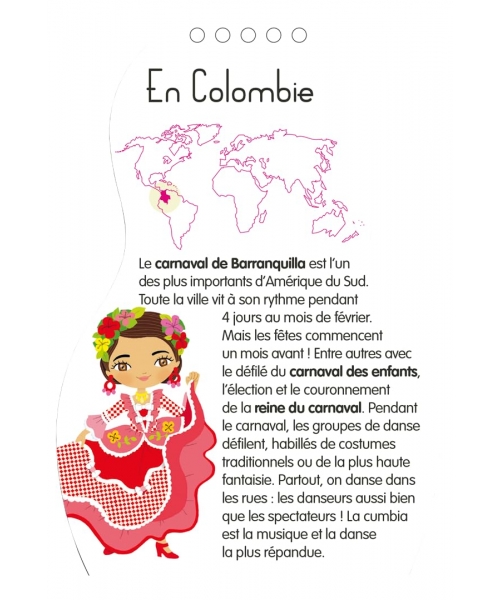 Et en plus, des infos documentaires sur les fêtes et carnavals du monde : les tenues folkloriques, les déguisements, les fêtes, la musique.