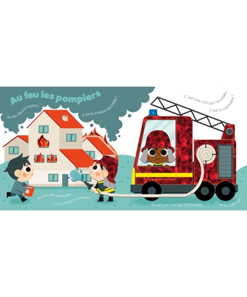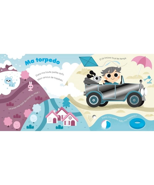 Retrouve l'incontournable comptine " Un tracteur " et fais tourner ses roues. Découvre " Mon vélo " et touche la route pailletée ! Chante " Le petit chemin de fer " et admire la fumée sortant de la locomotive. Découvre " Ma torpedo " et touche ses enjoliveurs. Écoute " Au feu les pompiers " et admire le camion de pompiers.