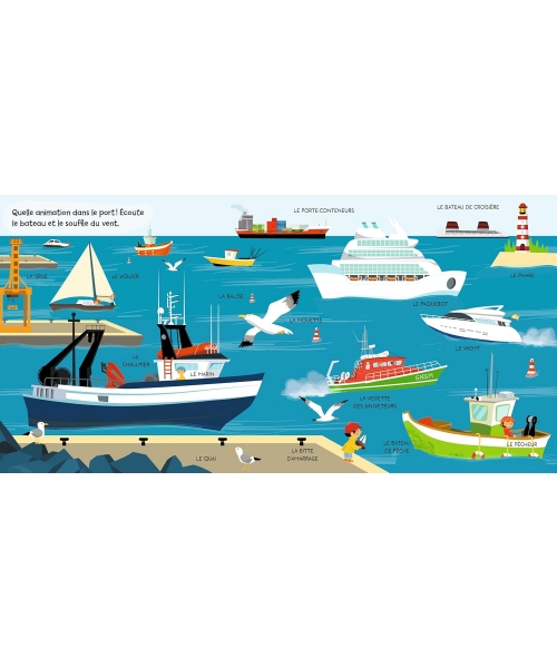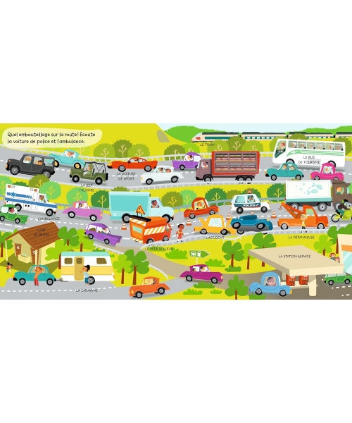 Un concept unique pour cet ouvrage : 12 puces sonores avec un bruit suivi d'une phrase descriptive pour que le tout-petit associe le son et l'image et apprenne des mots nouveaux. Ainsi, il entend le bruit de l'avion et écoute la description de ce qu'il entend : " L'avion décolle ".