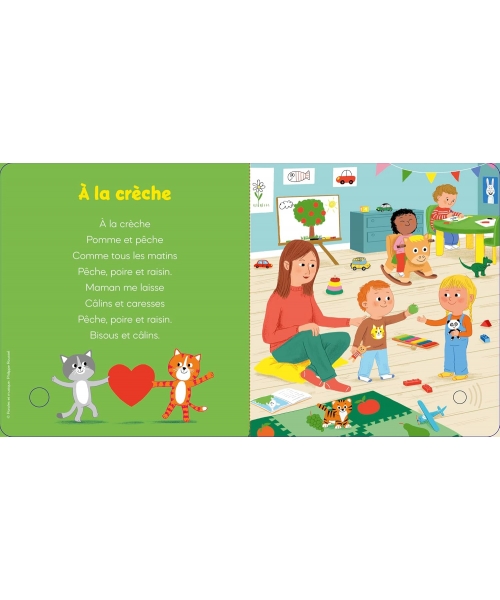 C'est avec des comptines originales et traditionnelles qu'on chante à la crèche : " A la crèche, pomme et pêche " de Philippe Roussel, l'incontournable " J'ai un nom, un prénom " ainsi que les grands classiques des tout petits : " Les petites marionnettes " ; " Petit cheval va au marché " et " Head, shoulders, knees and toes " pour chanter en anglais !