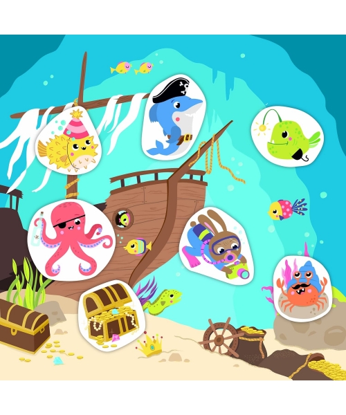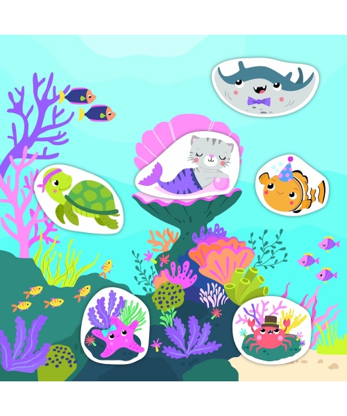 Cette pochette contient 25 stickers épais et repositionnables d'animaux de la mer à coller sur 4 décors différents.