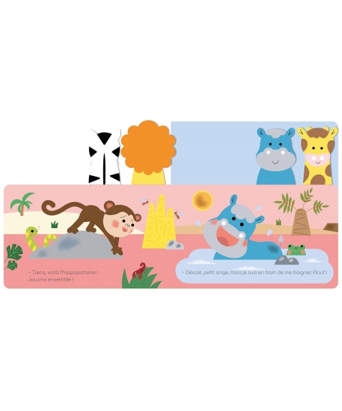 Une page après l'autre, découvre une marionnette de lion, de zèbre, de girafe et d'hippopotame, en feutrine toute douce.