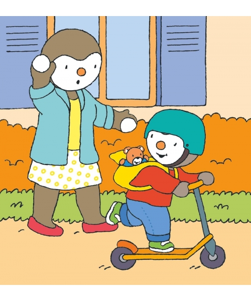 Aujourd'hui, T'choupi part à l'école en trottinette, accompagné par sa maman.