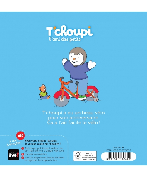 Nouveau : écoutez la version audio de l'histoire en scannant la couverture. Tous les albums T'choupi sont maintenant accompagnés d'une version audio, accessible gratuitement avec l'application Nathan Live.
