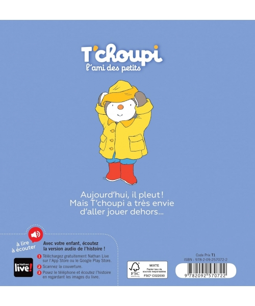 Nouveau : écoutez la version audio de l'histoire en scannant la couverture. Tous les albums T'choupi sont maintenant accompagnés d'une version audio, accessible gratuitement avec l'application Nathan Live.