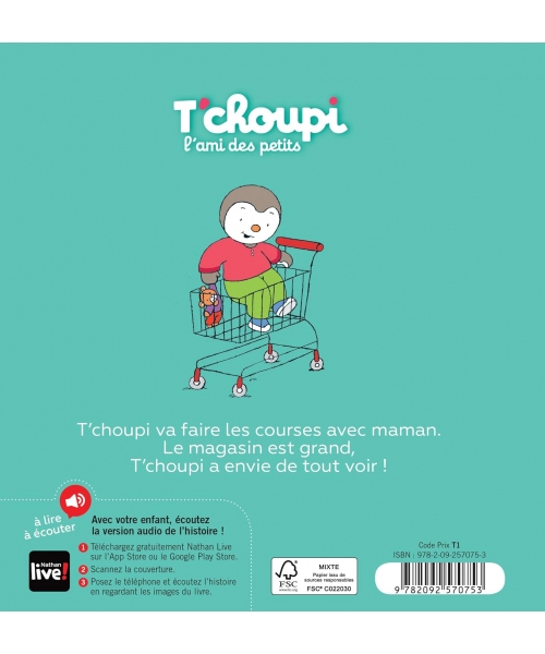 Nouveau : écoutez la version audio de l'histoire en scannant la couverture. Tous les albums T'choupi sont maintenant accompagnés d'une version audio, accessible gratuitement avec l'application Nathan Live.