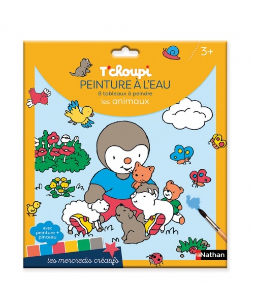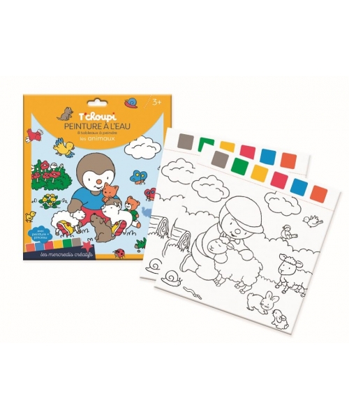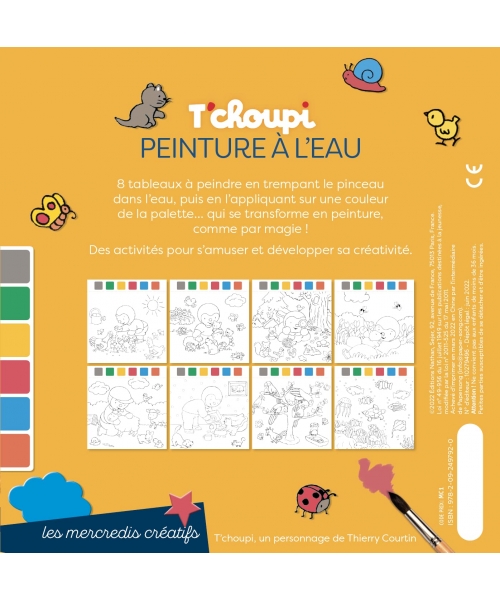 Cette pochette créative propose 8 tableaux T'choupi à peindre à l'aide d'une palette de peinture fournie sur chaque tableau. L'enfant trempe son pinceau dans l'eau, applique son pinceau sur la couleur de son choix qui se transforme en peinture, et peint la scène.