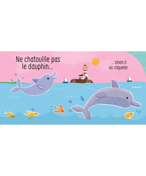 Ne chatouille pas le dauphin... sinon il va cliqueter ! Chaque page de ce livre sonore comporte une matière à toucher qui déclenche un son : en plus du dauphin, tu pourras entendre les bruits amusants que font une loutre, une tortue de mer et un pélican. A la fin du livre appuie sur la puce sonore pour retrouver tous les sons du livre dans un immense brouhaha !