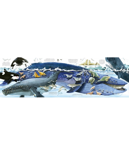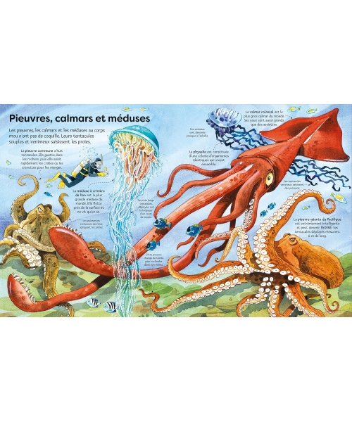 Dans cet album documentaire, les enfants vont découvrir des dizaines d'animaux marins, de la pieuvre géante du Pacifique au concombre de mer, en passant par le léopard de mer, le bélouga ou encore la baleine bleue. A chaque page ils retrouveront soit deux très grands rabats soit un dépliant géant de quatre pages qui s'ouvre en accordéon.