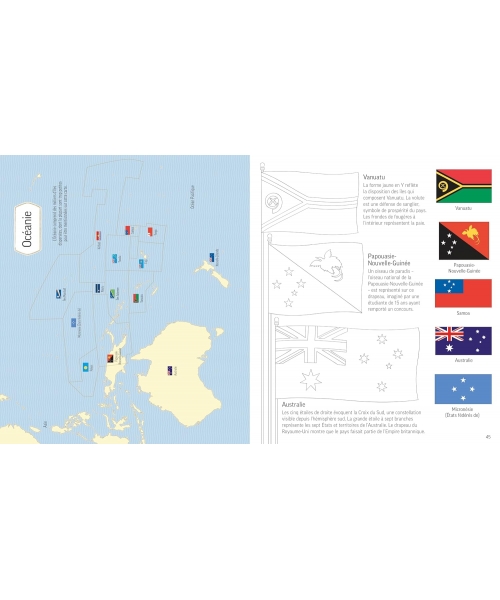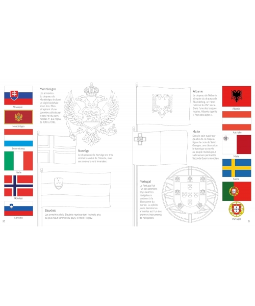 Un livre de coloriage pour découvrir le drapeau national de tous les pays indépendants du monde, regroupés par continent. Les enfants trouveront des cartes associant chaque drapeau à son pays, des informations sur les couleurs et les symboles des drapeaux, ainsi que des drapeaux et des armoiries en noir et blanc à colorier soi-même.