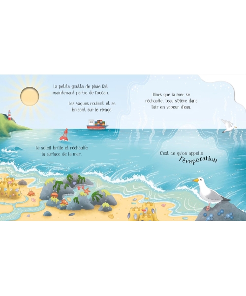 Une goutte de pluie tombe du ciel ... les tout-petits vont la suivre dans son voyage jusqu'à la mer, où elle s'évaporera pour former un nuage et recommencer le cycle à nouveau. Ce petit documentaire va éveiller la curiosité des tout-petits à chaque page grâce à ses illustrations adaptées et ses découpes ingénieuses. Spécialement écrit pour les très jeunes lecteurs, ce livre est une introduction parfaite aux merveilles de la nature.