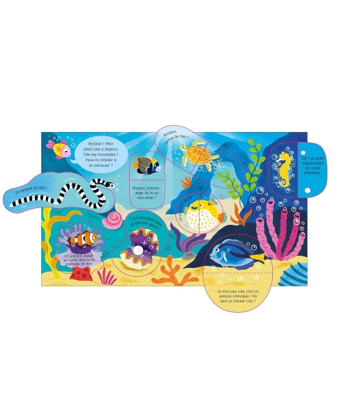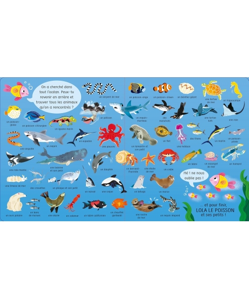 Un petit poisson parcourt l'océan à la recherche de son amie, peux-tu l'aider à la retrouver ? En soulevant les rabats solides de ce livre, les enfants pourront explorer les océans et rencontrer des dizaines d'animaux marins, du poisson-clown caché dans un récif coralien à une orque nageant dans l'océan Arctique. Avec un imagier à la dernière page pour retrouver tous les animaux marins et apprendre leurs noms.
