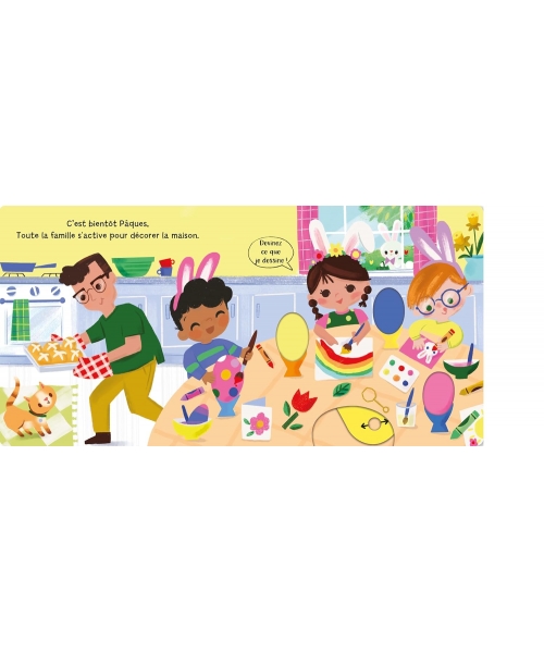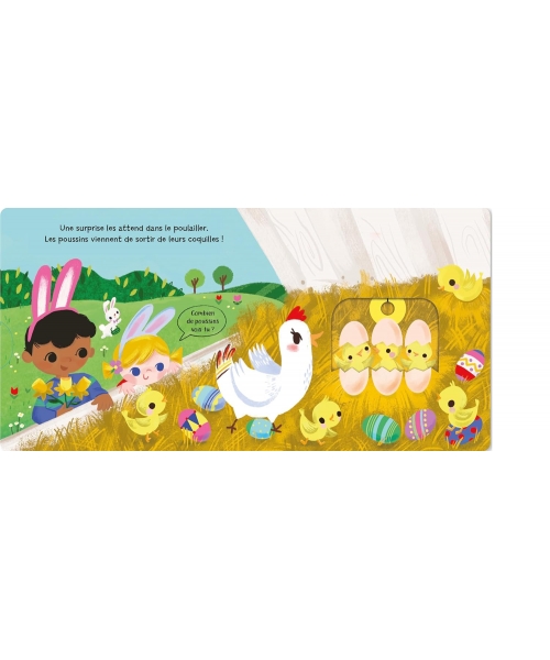 Un livre tout carton avec des tirettes. Un livre tout carton avec des tirettes et des roues à tourner pour découvrir Pâques (décorer des oeufs, la chasse aux oeufs, la naissance des poussins, le pique-nique...) et favoriser la dextérité des petites mains. Avec un cherche et trouve sur toutes les pages.