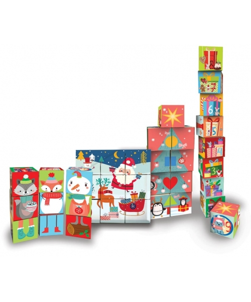 Manipuler, imaginer, associer, empiler... et faire tomber ! Avec le jeu de cubes, le tout-petit comprend que son geste donne un résultat. Quel plaisir ! Plus encore quand il s'agit de s'amuser avec le Père Noël, ses rennes et ses lutins. Un joli coffret de 9 cubes cartonnés et 6 combinaisons différentes pour faire des puzzles, créer un chamboule-tout, associer des moitiés ou encore imaginer des personnages fantaisistes... Un Père Noël avec des cornes de renne et un corps de lutin, c'est rigolo !