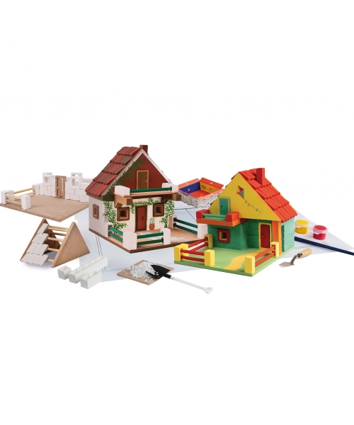 Escape to the mountains with the Cottage kit! Build a charming cottage complete with real construction tools and materials. Lay bricks, install the roof, mix plaster, and paint your cottage just the way you like it. Use all the included materials: bricks, plaster, putty, roof tiles, and wood pieces—along with your tools to bring your cottage to life.