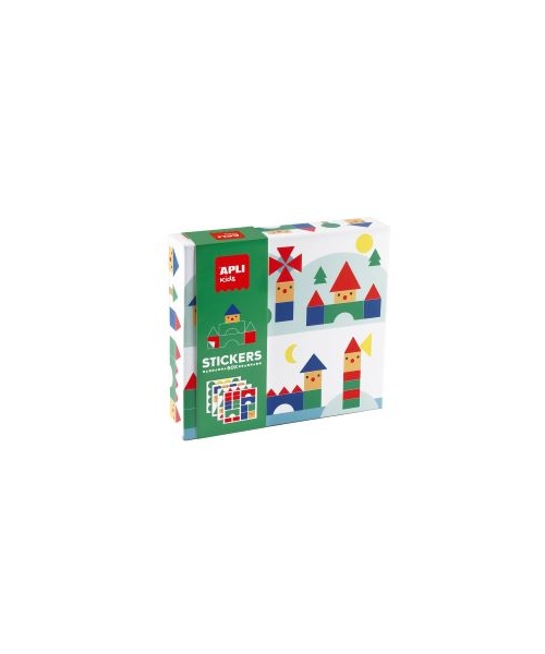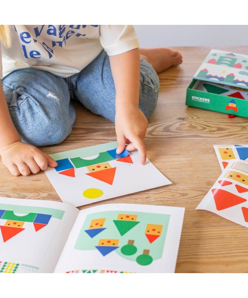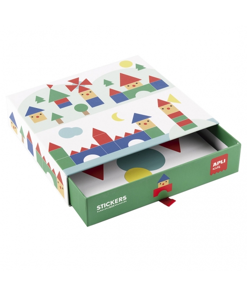 Geometric stickers game, Villages model in cardboard box. The purpose of the game is to complete the drawings on the cards using different geometrical stickers.