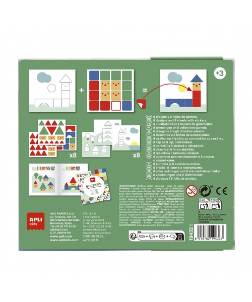 The game includes: 8 illustrated cards, 8 sheets with removable educational stickers and 1 full-color example guide. The removable stickers enable the child to correct if they make a mistake.