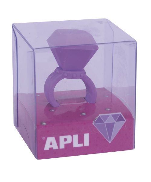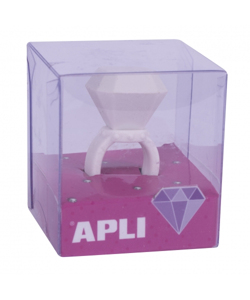 Diamong ring shaped erasers that can be used for erasing and for playing. Display with 20 erasers in 4 different colours: pink, purple, blue and white.