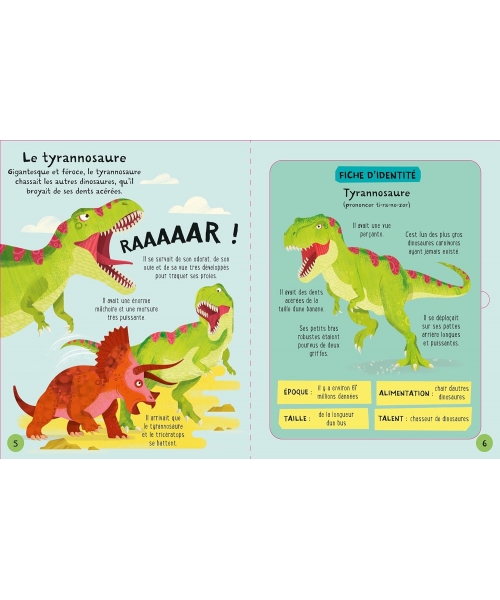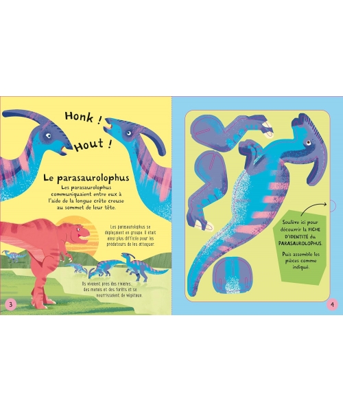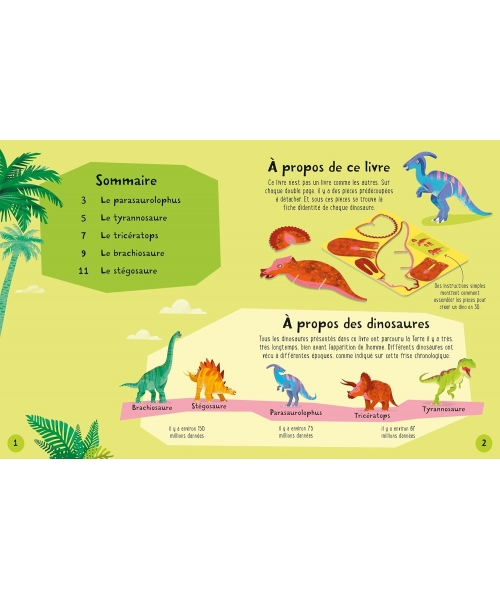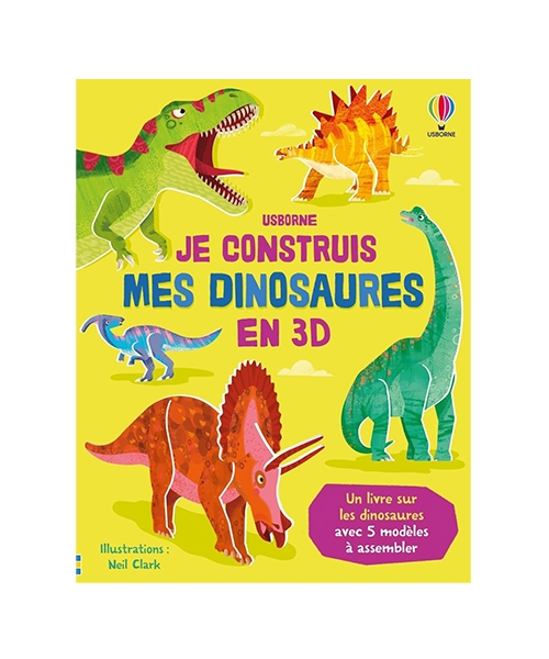 Un T-rex, un tricératops, un brachiosaure, un stégosaure et un parasaurolophus : détache les pièces cartonnées du livre et construis tes propres dinosaures en 3D ! Les dinosaures sont faciles à détacher et à assembler grâce à des instructions simples et détaillées. Sur les autres pages du livre, les enfants pourront découvrir des informations fascinantes sur ces cinq dinosaures.