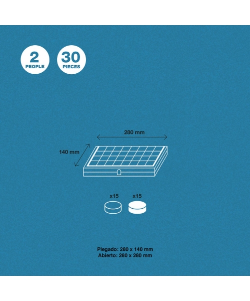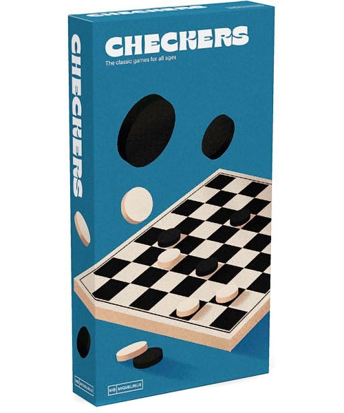 Traditional checkers game on a portable folding board. Contains and stores 30 checkers (15 white and 15 black).