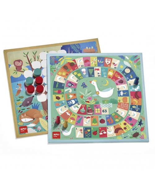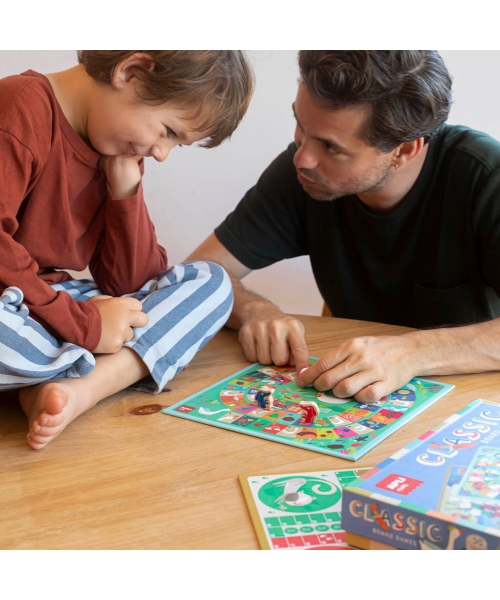 Four classic board games brought together into one with adorable illustrations: the groose game, parcheesi, four in a row and dogs and ladders. Ideal for family afternoons!