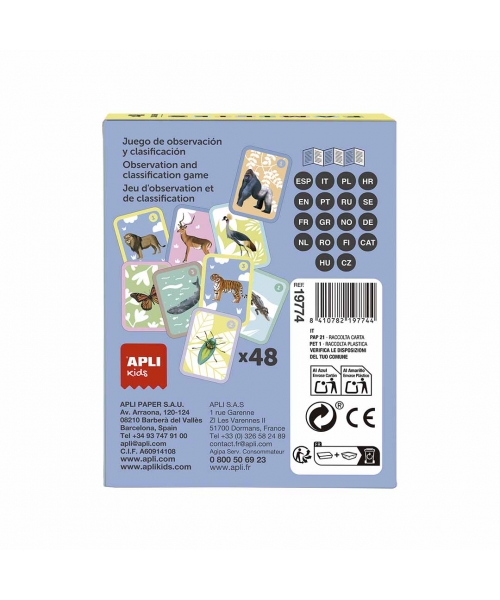 Card game Families of observation and classification with animal theme. Includes 48 double-side cards and a drop-down with instructions. Card size: 63 x 88 mm.