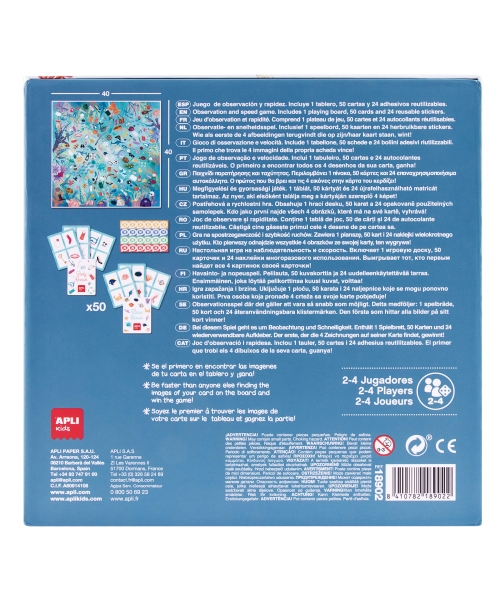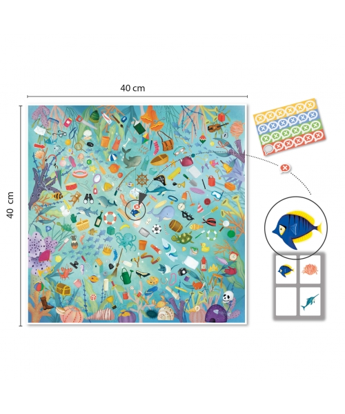 Observation and speed game Save the Ocean. Players have to find as fast as possible the 4 images of their card on the board to win.