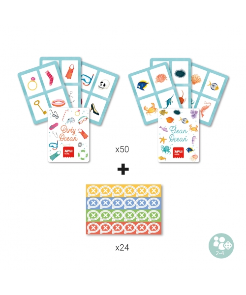 The game includes cards with images of objects that represent the trash we find in the ocean and the animals and plants that live underwater, so that children will learn about the environment while they play.