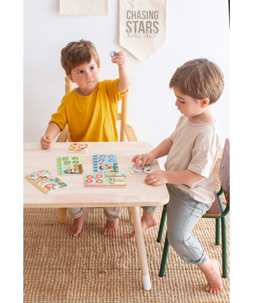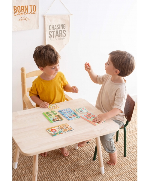 Wooden Memo Loto game. A game of memory and deduction where each player must complete their shopping list with 4 items, each one from a different shop: the toy shop, the grocery, the bakery and the florist's.